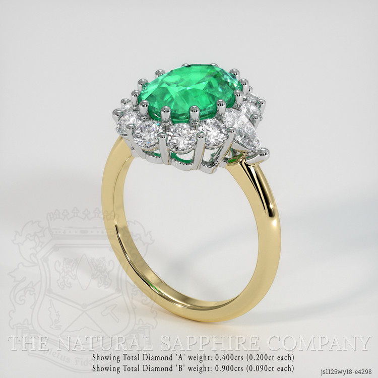 This ring centers on a transparent 2.20 carat oval green emerald, measuring 9.94 x 7.83 x 5.13 mm, cut in a mixed brilliant style to balance rich color and lively faceting, clarity grade very slightly included, evaluated at eye level, medium intense color saturation, excellent polish, enhancement standard, origin Brazil. The primary stone is set within a diamond halo composed of natural white round diamonds weighing approximately 0.90 carats in total, clarity Very Slightly Included VS1 and VS2, color grade F, and accentuated by white pear shaped natural diamonds weighing approximately 0.40 carats, clarity Very Slightly Included VS1 and VS2, color grade E, for an approximate total diamond weight of 1.30 carats. The upper setting and halo are crafted in 18K white gold to maximize the color contrast and brilliance of the diamonds and emerald, while the band and lower shank are formed in 18K yellow gold to provide a warm, enduring profile. The design combines classic proportions with precision gem setting, using secure prong work to expose the emerald face up and allow light to interact with the mixed brilliant facets, while the graduated diamond halo frames the center stone to enhance its perceived scale and optical depth.