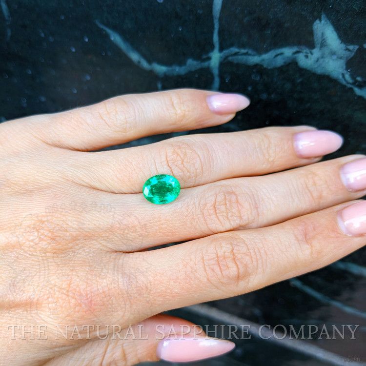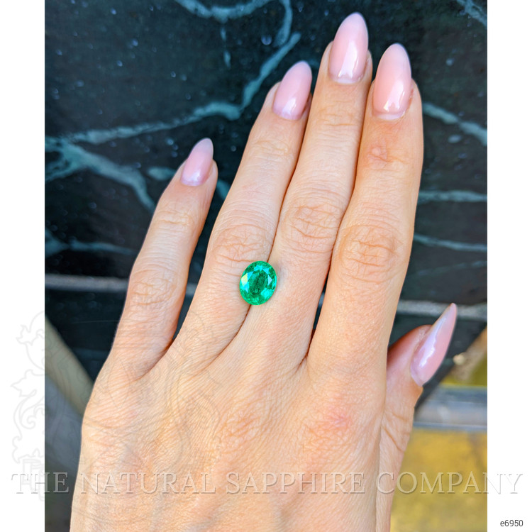 Our artisans at The Natural Emerald Company have further enhanced this stone’s natural beauty through expert craftsmanship. With dimensions of 9.87 x 7.76 x 4.89 mm, the emerald is fashioned into an oval shape, featuring a mixed brilliant cut. Each facet is a testament to patience and skill, revealing a clarity grade of very slightly included, which when viewed at eye level, presents an unsurpassed brilliance. The excellent polish ensures that every surface of the gem glimmers with a lush green radiance, embodying nature’s grandeur like none other.