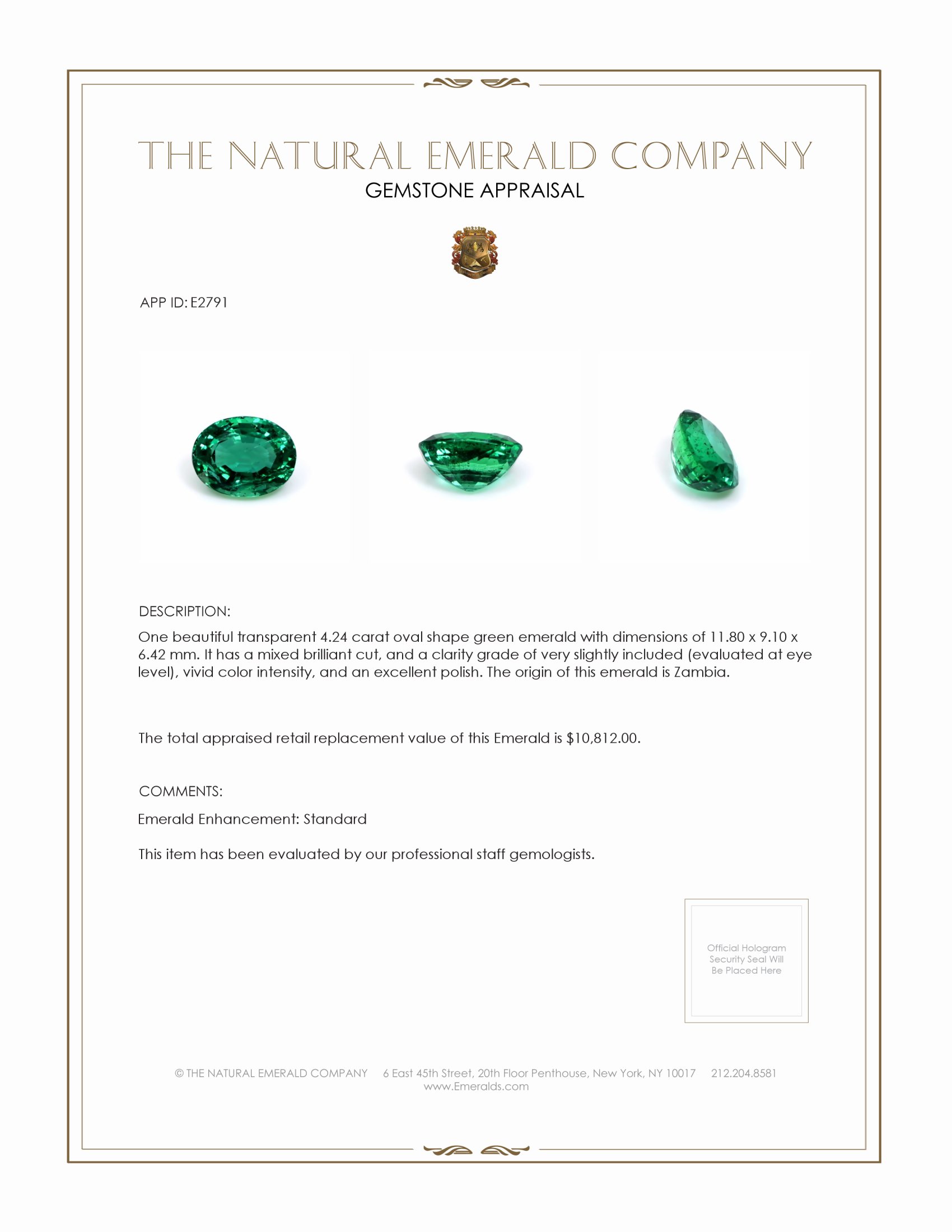The ring features a beautiful, transparent 4.24 carat oval shape green emerald with the dimensions of 11.80 x 9.10 x 6.42 mm and a mixed brilliant cut. It has a clarity grade of very slightly included (evaluated at eye level), intense color saturation, and an excellent polish. The origin of this emerald is Zambia.
