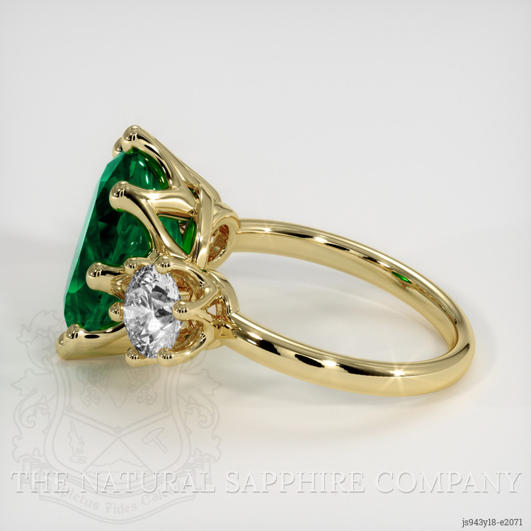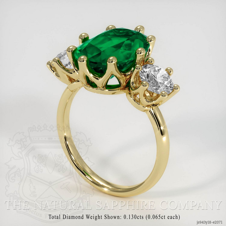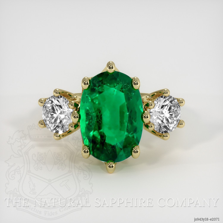 The ring features a beautiful, transparent GIA certified 4.54 carat oval shape green emerald with the dimensions of 13.21 x 9.13 x 6.26 mm and a mixed brilliant cut. It has a clarity grade of very slightly included (evaluated at eye level), vivid color saturation, and an excellent polish. The origin of this emerald is Zambia.