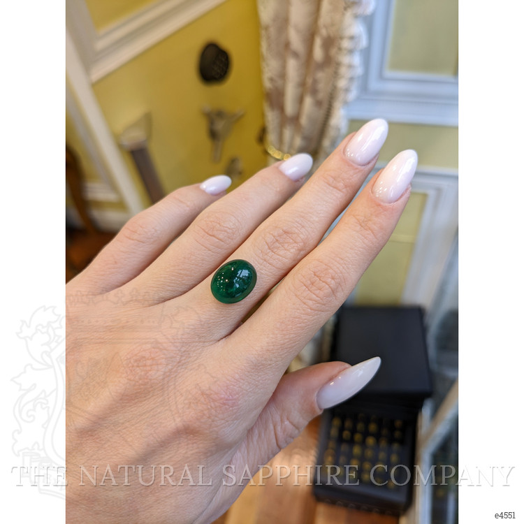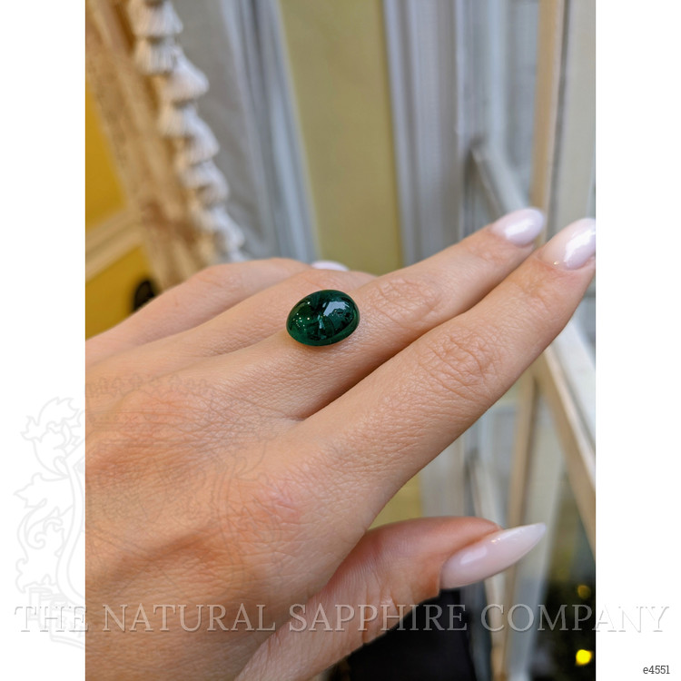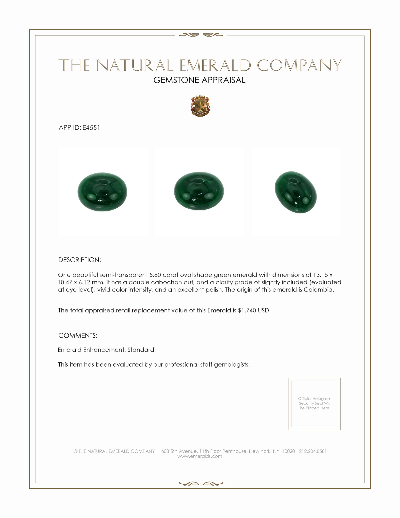 Introducing a distinguished piece from The Natural Emerald Company, a men's ring that epitomizes elegance and sophistication. This remarkable ring showcases a stunning 5.80 carat green emerald, cut into an esteemed double cabochon style, which graces the finger with its seamless elegance. The emerald, originating from the renowned mines of Colombia, boasts prestigious dimensions of 13.15 x 10.47 x 6.12 mm. Its pristine semi-transparent quality, coupled with a clarity grade described as slightly included yet evaluated at eye level, delivers a captivating effect. The vivid color saturation of the green hue is enhanced by its excellent polish, reflecting light with remarkable brilliance.