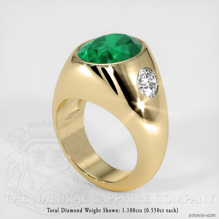 The men's ring features a beautiful, transparent 5.84 carat oval shape green emerald with the dimensions of 13.06 x 10.07 x 7.77 mm and a mixed brilliant cut. It has a clarity grade of included (evaluated at eye level), intense color saturation, and an excellent polish. The origin of this emerald is Zambia.