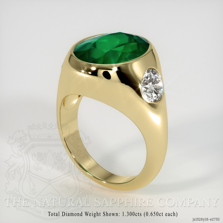The men's ring features a beautiful, transparent 6.17 carat oval shape green emerald with the dimensions of 13.70 x 11.13 x 6.66 mm and a mixed brilliant cut. It has a clarity grade of slightly included (evaluated at eye level), vivid color saturation, and an excellent polish. The origin of this emerald is Zambia.