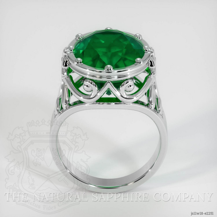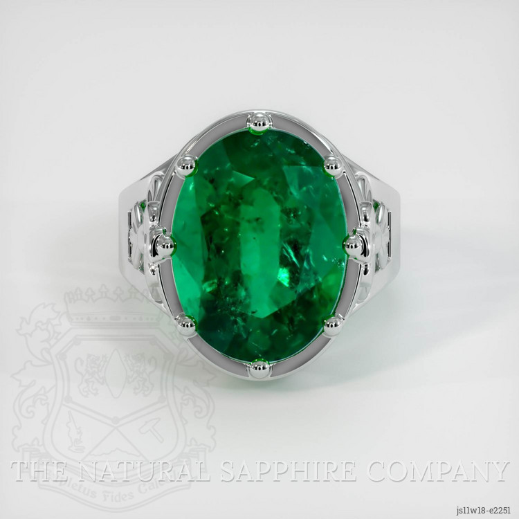 The ring features a beautiful, transparent 8.76 carat oval shape green emerald with the dimensions of 15.45 x 11.47 x 8.32 mm and a step cut. It has a clarity grade of included (evaluated at eye level), vivid color saturation, and an excellent polish. The origin of this emerald is Zambia.