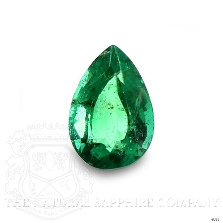 The ring features a beautiful, transparent 0.41 carat pear shape green emerald with the dimensions of 5.97 x 4.10 x 2.96 mm and a mixed brilliant cut. It has a clarity grade of slightly included (evaluated at eye level), intense color saturation, and an excellent polish. The origin of this emerald is Zambia.