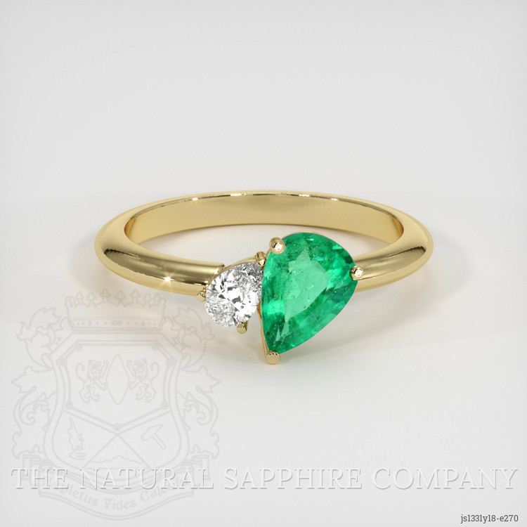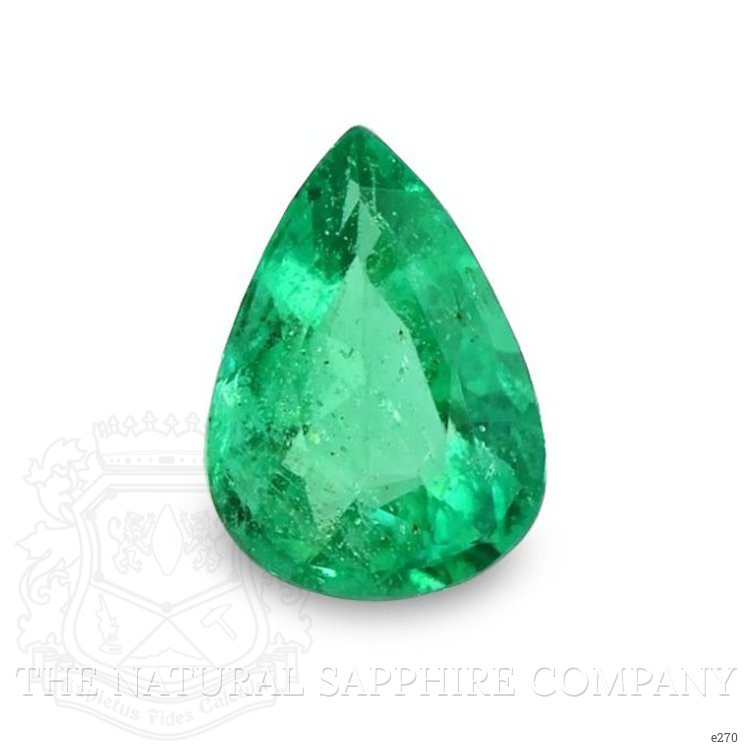 The ring features a beautiful, transparent 0.51 carat pear shape green emerald with the dimensions of 6.96 x 4.96 x 2.77 mm and a mixed brilliant cut. It has a clarity grade of slightly included (evaluated at eye level), light color saturation, and an excellent polish. The origin of this emerald is Zambia.