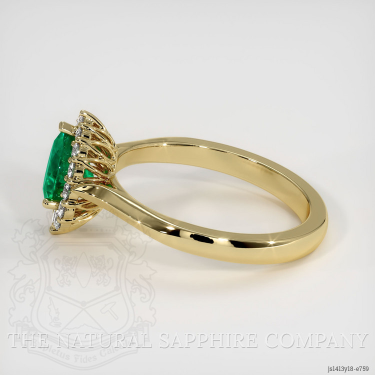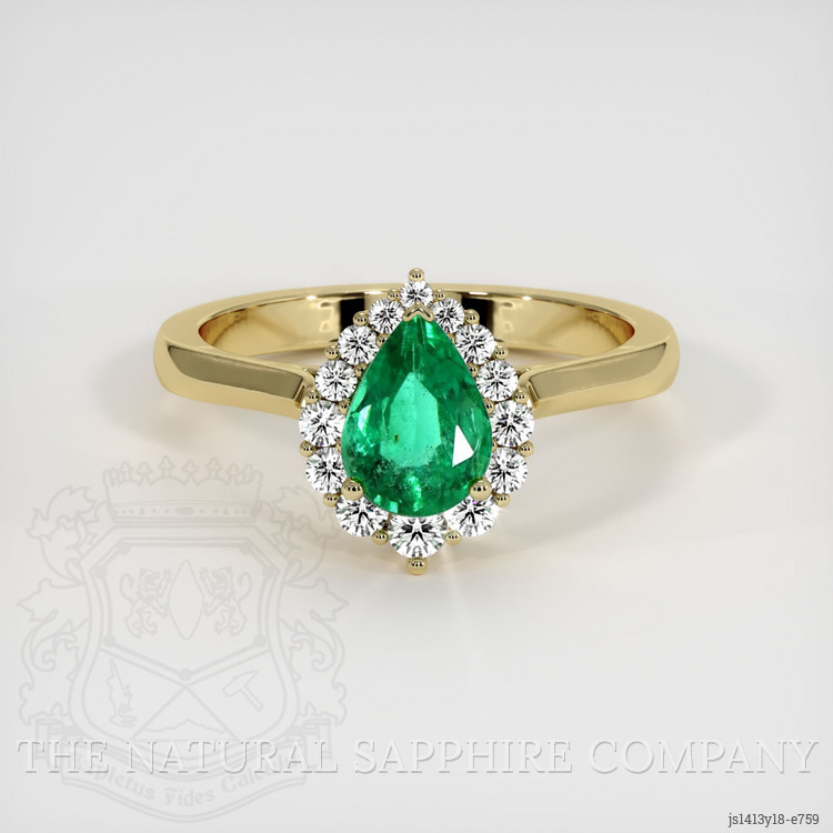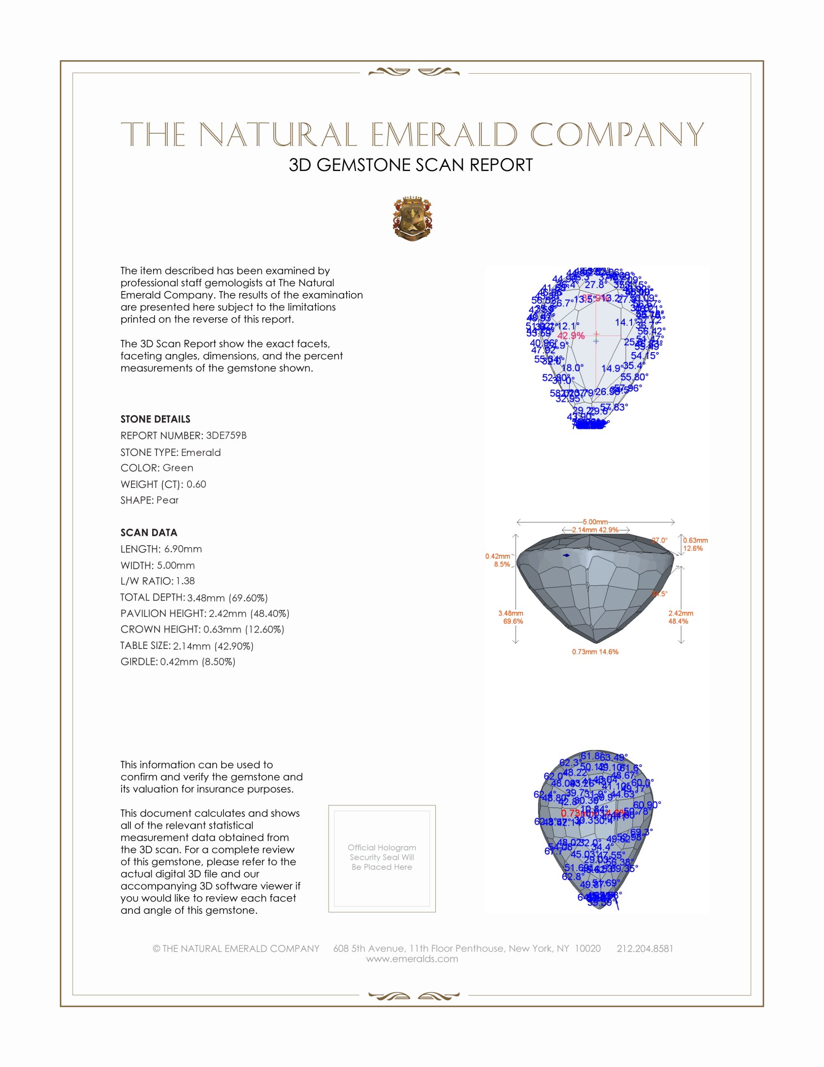 The ring features a beautiful, transparent 0.60 carat pear shape green emerald with the dimensions of 6.90 x 5.00 x 3.48 mm and a mixed brilliant cut. It has a clarity grade of slightly included (evaluated at eye level), intense color saturation, and an excellent polish. The origin of this emerald is Zambia.