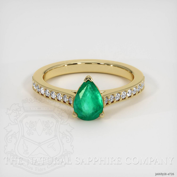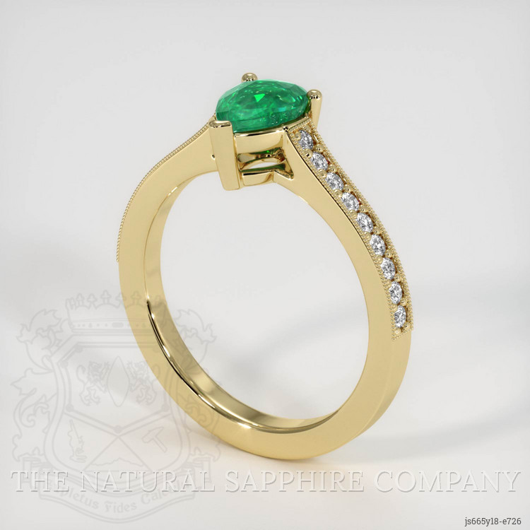 The ring features a beautiful, transparent 0.66 carat pear shape green emerald with the dimensions of 7.23 x 5.06 x 3.45 mm and a mixed brilliant cut. It has a clarity grade of very slightly included (evaluated at eye level), medium color saturation, and an excellent polish. The origin of this emerald is Zambia.
