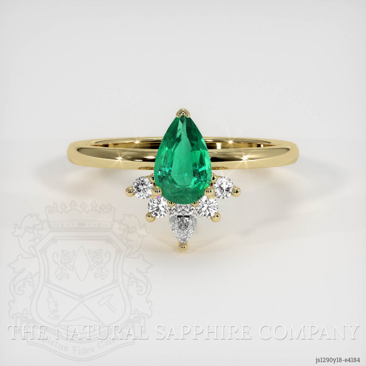 The ring features a beautiful, transparent 0.70 carat pear shape green emerald with the dimensions of 8.19 x 5.05 x 3.20 mm and a mixed brilliant cut. It has a clarity grade of very slightly included (evaluated at eye level), medium intense color saturation, and an excellent polish. The origin of this emerald is Zambia.