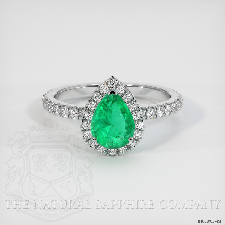 The ring features a beautiful, transparent 0.82 carat pear shape green emerald with the dimensions of 7.89 x 5.99 x 3.69 mm and a mixed brilliant cut. It has a clarity grade of slightly included (evaluated at eye level), medium color saturation, and an excellent polish. The origin of this emerald is Zambia.