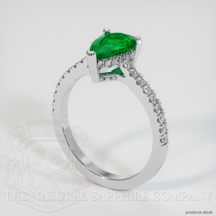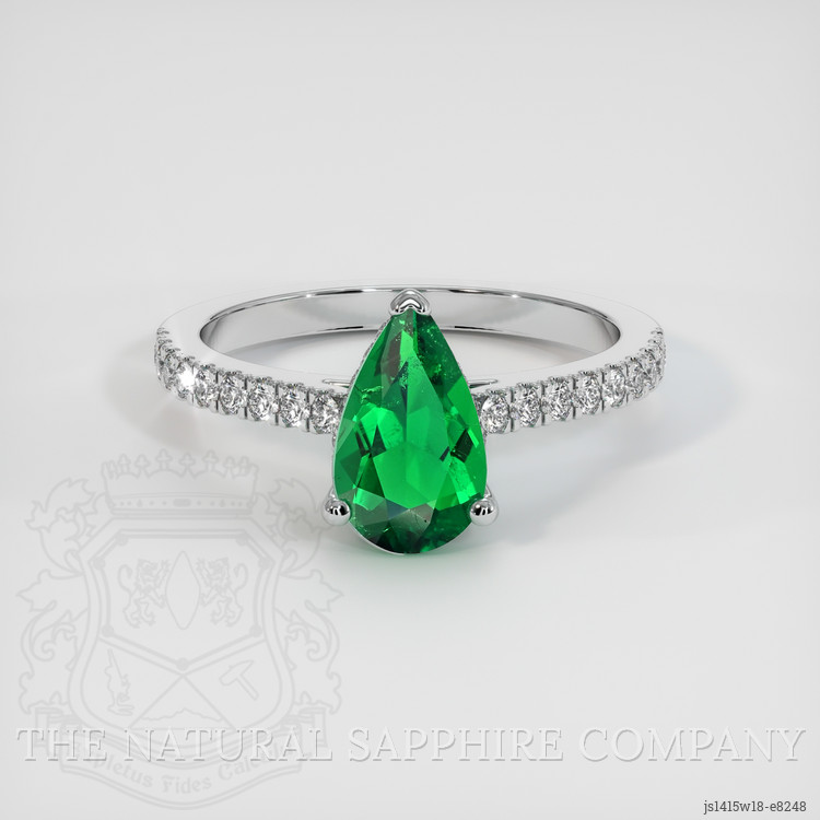 Surrounding this magnificent center stone are carefully chosen white round natural diamonds, selected to complement rather than compete with the emerald, and to add a refined halo of light and motion. The accent diamonds total approximately 0.36 carats, comprised of stones of 0.21 carats, 0.105 carats, and 0.045 carats, each graded VS for clarity and F or G for color, ensuring a bright, near colorless brilliance that frames the central green with elegant contrast. These diamonds are pavé set along the shoulders and integrated into the gallery in a refined arrangement that enhances the pear silhouette and elevates the visual balance of the design. The interplay between the vivid Colombian green and the icy clarity of F and G color diamonds creates a sophisticated dialogue of color and fire, and the mixed brilliant cut of the emerald ensures that every subtle movement catches and scatters light in a way that feels alive and unique.