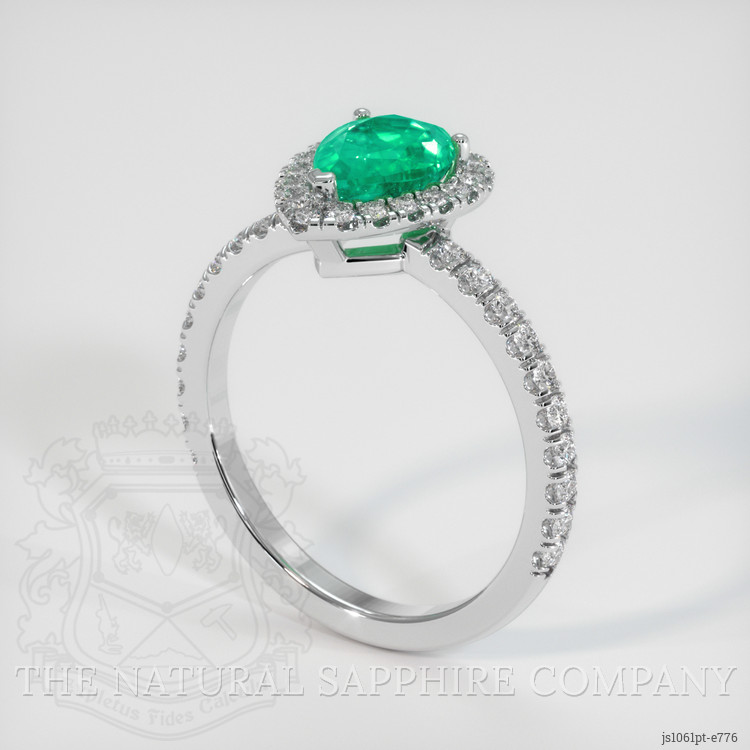 The ring features a beautiful, transparent 0.95 carat pear shape green emerald with the dimensions of 7.88 x 6.07 x 3.40 mm and a mixed brilliant cut. It has a clarity grade of slightly included (evaluated at eye level), light color saturation, and an excellent polish. The origin of this emerald is Zambia.