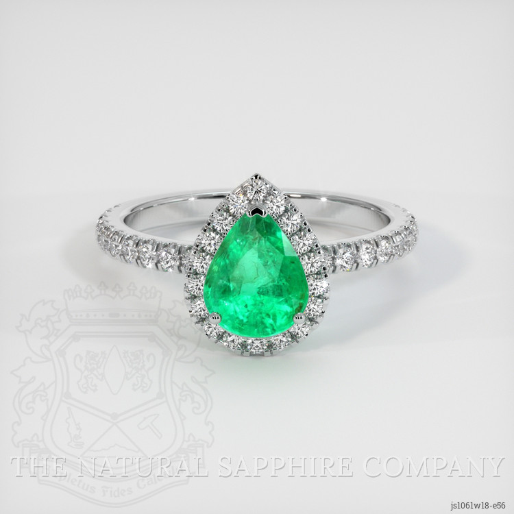 The ring features a beautiful, transparent 1.01 carat pear shape green emerald with the dimensions of 8.11 x 5.95 x 4.33 mm and a mixed brilliant cut. It has a clarity grade of slightly included (evaluated at eye level), medium color saturation, and an excellent polish. The origin of this emerald is Zambia.