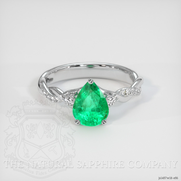 The ring features a beautiful, transparent 1.01 carat pear shape green emerald with the dimensions of 8.11 x 5.95 x 4.33 mm and a mixed brilliant cut. It has a clarity grade of slightly included (evaluated at eye level), medium color saturation, and an excellent polish. The origin of this emerald is Zambia.