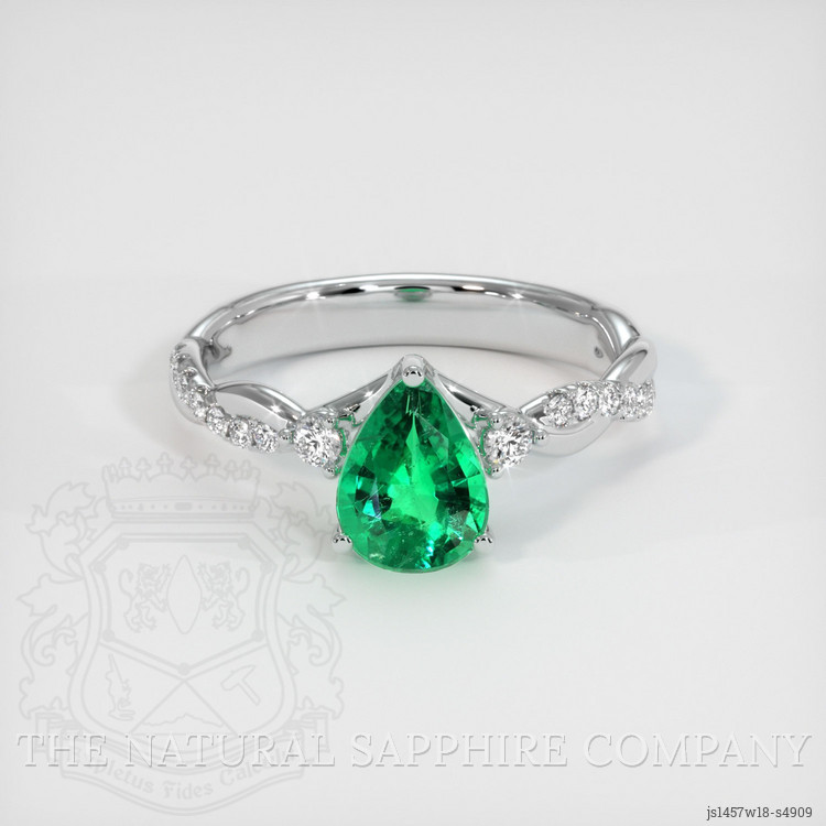 The ring features a beautiful, transparent 1.01 carat pear shape green emerald with the dimensions of 8.38 x 6.30 x 3.89 mm and a mixed brilliant cut. It has a clarity grade of very slightly included (evaluated at eye level), vivid color saturation, and an excellent polish. The origin of this emerald is Zambia.