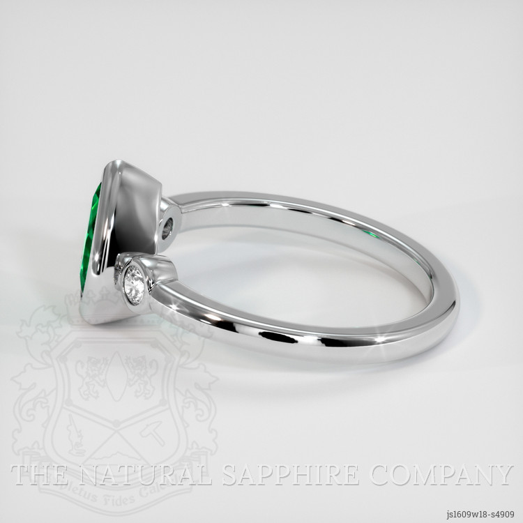 Adding to its uniqueness are two white, round-shaped diamonds that gracefully flank the central emerald. These diamonds, weighing approximately 0.04 carats with an exquisite VS1 and VS2 clarity grade, and an F color grade, bring an additional shimmer that perfectly complements the vibrant hue of the emerald. This harmonious combination of stones emphasizes the luxury conveyed by this masterpiece, setting you among an elite few who can call this artful creation their own.