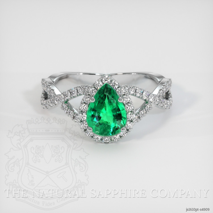 The ring features a beautiful, transparent 1.01 carat pear shape green emerald with the dimensions of 8.38 x 6.30 x 3.89 mm and a mixed brilliant cut. It has a clarity grade of very slightly included (evaluated at eye level), vivid color saturation, and an excellent polish. The origin of this emerald is Zambia.