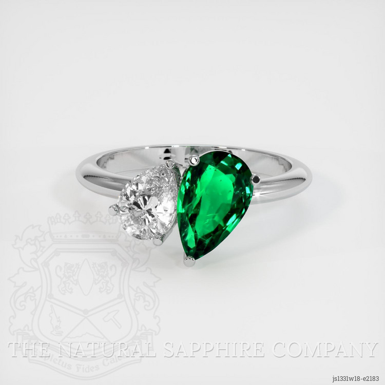 The ring features a beautiful, transparent 1.36 carat pear shape green emerald with the dimensions of 9.26 x 5.73 x 4.45 mm and a mixed brilliant cut. It has a clarity grade of very slightly included (evaluated at eye level), vivid color saturation, and an excellent polish. The origin of this emerald is Zambia.