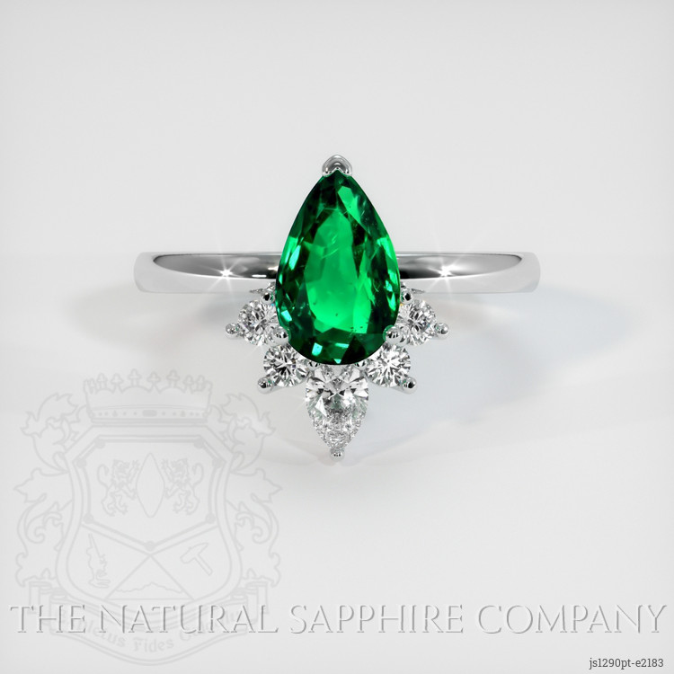 The ring features a beautiful, transparent 1.36 carat pear shape green emerald with the dimensions of 9.26 x 5.73 x 4.45 mm and a mixed brilliant cut. It has a clarity grade of very slightly included (evaluated at eye level), vivid color saturation, and an excellent polish. The origin of this emerald is Zambia.