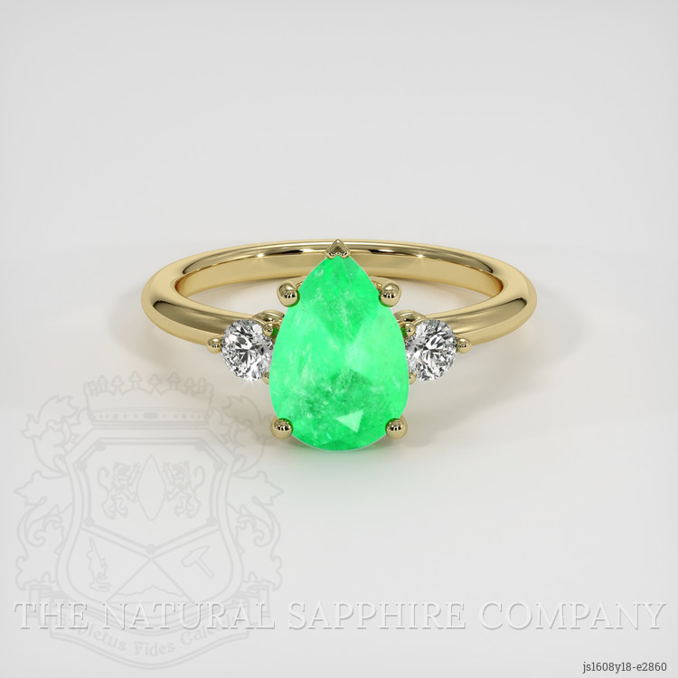 The ring showcases a stunning pear-shaped Colombian emerald, weighing 1.46 carats, with precise dimensions of 9.35 by 6.48 by 5.16 mm. This gemstone features a mixed brilliant cut, which enhances its vibrant appearance, and exhibits an intense color saturation that demands attention. Evaluated at eye level, the emerald holds a slightly included clarity, offering a pristine visual experience while maintaining its natural charm. The emerald further displays an excellent polish, adding to its brilliance and allure.