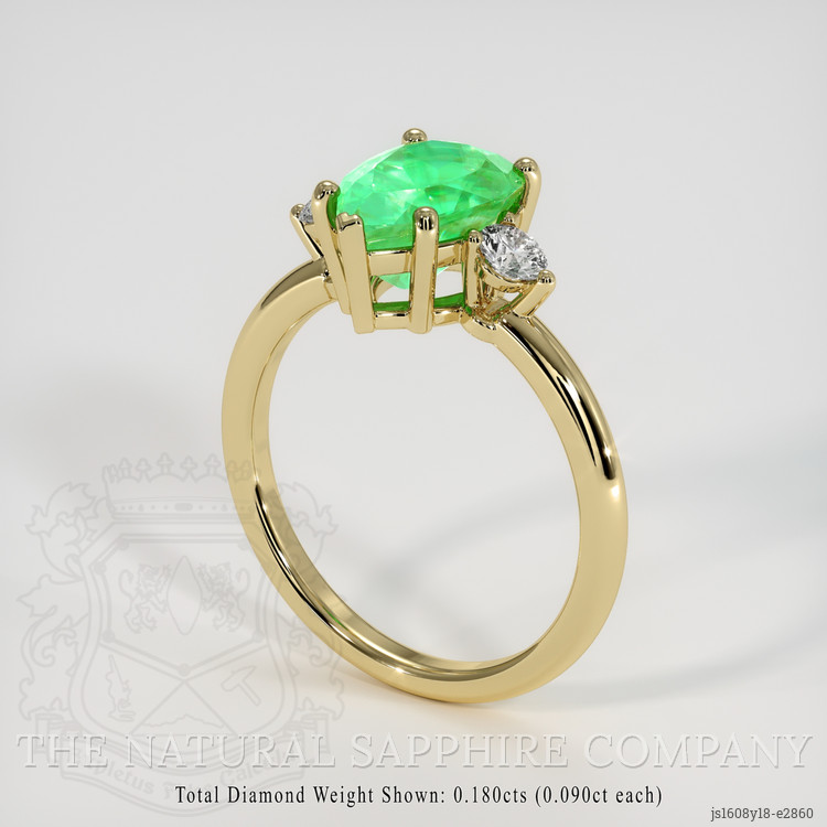 Adorning the emerald are white round diamonds, weighing approximately 0.18 carats in total. These diamonds possess a clarity grade of Very Slightly Included, from VS1 to VS2, ensuring minimal imperfections, and boast an impressive color grade of F, showcasing near-colorless beauty to accompany the vivid green centerpiece.
