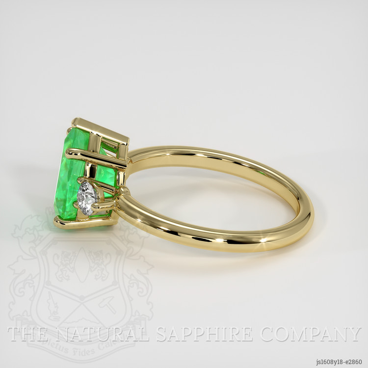 The entire arrangement is elegantly set in 18K yellow gold, which complements the vibrant hue of the emerald and the brilliance of the diamonds. The craftsmanship of the setting is intricately designed to enhance the gemstone’s prominence, ensuring that each facet and angle is presented to its best advantage. The setting is meticulously crafted to allow light to illuminate the emerald, enhancing its natural glow and bestowing a regal presence to the piece. The luxurious 18K yellow gold provides a timeless backdrop that highlights the intricate details and superior quality of each element, making this ring not only a symbol of elegance but also a testament to meticulous craftsmanship and design expertise.