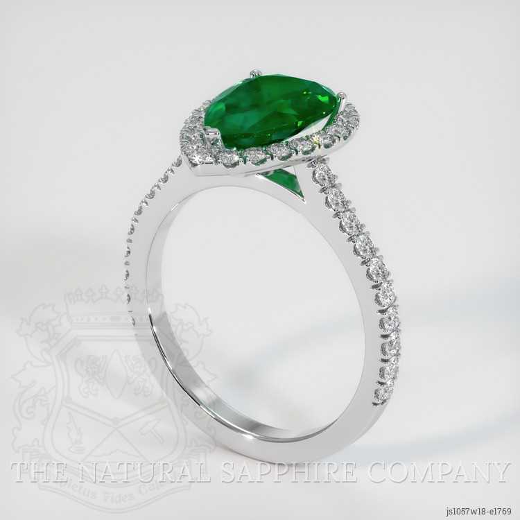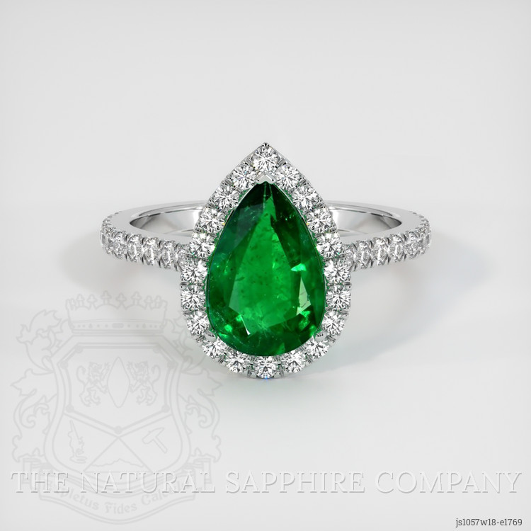 The ring features a beautiful, transparent 1.49 carat pear shape green emerald with the dimensions of 10.68 x 7.05 x 3.74 mm and a mixed brilliant cut. It has a clarity grade of very slightly included (evaluated at eye level), vivid color saturation, and an excellent polish. The origin of this emerald is Zambia.