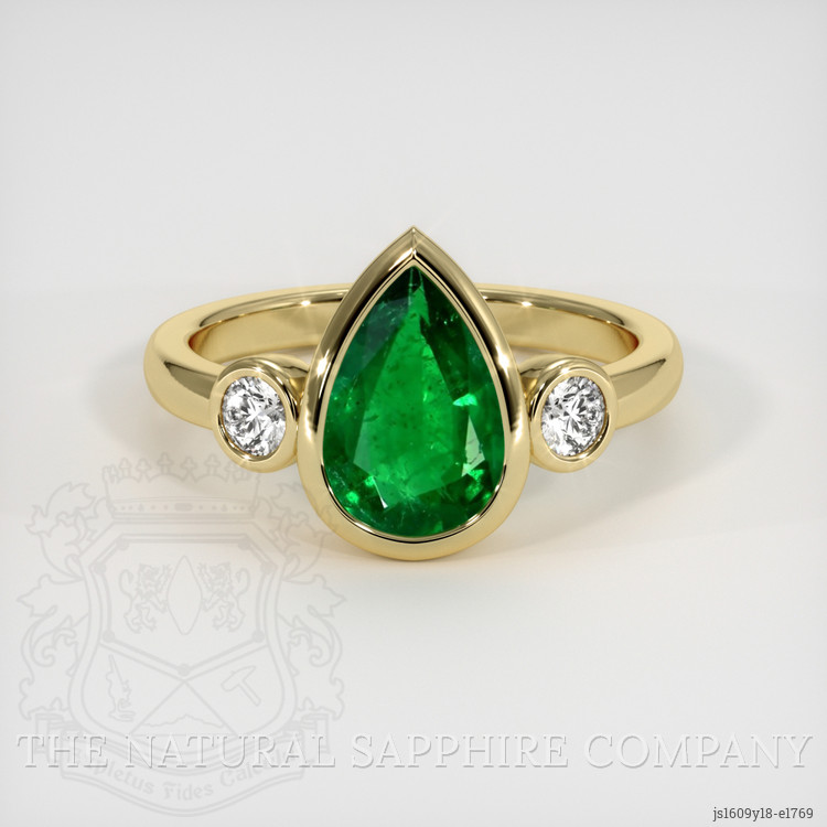 The ring features a beautiful, transparent 1.49 carat pear shape green emerald with the dimensions of 10.68 x 7.05 x 3.74 mm and a mixed brilliant cut. It has a clarity grade of very slightly included (evaluated at eye level), vivid color saturation, and an excellent polish. The origin of this emerald is Zambia.