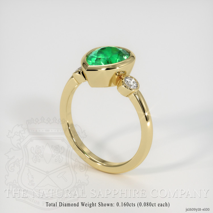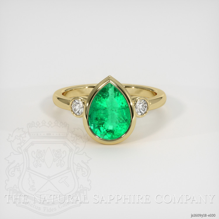 The ring features a beautiful, transparent 1.54 carat pear shape green emerald with the dimensions of 9.67 x 6.87 x 4.25 mm and a mixed brilliant cut. It has a clarity grade of slightly included (evaluated at eye level), intense color saturation, and an excellent polish. The origin of this emerald is Zambia.