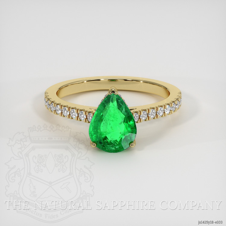 This ring centers on a transparent pear shape green emerald weighing 1.61 carat, with dimensions 9.20 x 7.03 x 4.39 mm, cut in a mixed brilliant style, showing vivid color saturation and an excellent polish. The emerald is graded slightly included at eye level and has undergone standard enhancement consistent with high quality Zambian material, and the origin is Zambia. Accompanying the emerald are white round natural diamonds with individual weights of approximately 0.24 carat, 0.113 carat, and 0.045 carat, all graded VS for clarity and F G for color. The diamonds are set along the shank and gallery in a refined pavé and accent configuration that complements the center stone. The entire mounting is crafted in 18K yellow gold, providing a warm tone that enhances the vivid green of the emerald, and the workmanship reflects The Natural Emerald Company standards for setting and finishing.