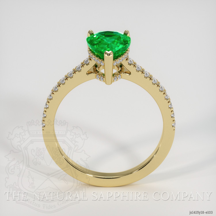 The durability of the ring reflects a balance of aesthetic elevation and practical protection. Emerald, measured at approximately 7.5 to 8 on the Mohs scale, is softer and more brittle than diamond, and the presence of natural inclusions influences impact resistance and susceptibility to chipping, particularly at pointed areas of shaped cuts. The pear shape introduces a vulnerable tip, however this design employs four secure prongs and a raised gallery that help shield the point from direct blows and abrasion. The pavé diamonds along the shank reduce exposed metal edges and distribute stress across multiple settings, while the 18K yellow gold mounting offers malleability that allows for precise prong work and future repair. Compared to similar market offerings, this ring is more protective than open solitaire designs with minimally supported tips, and it is less protective than full bezel or halo styles that completely surround the stone, or than comparable pieces set in platinum which provide higher resistance to deformation and scratching.