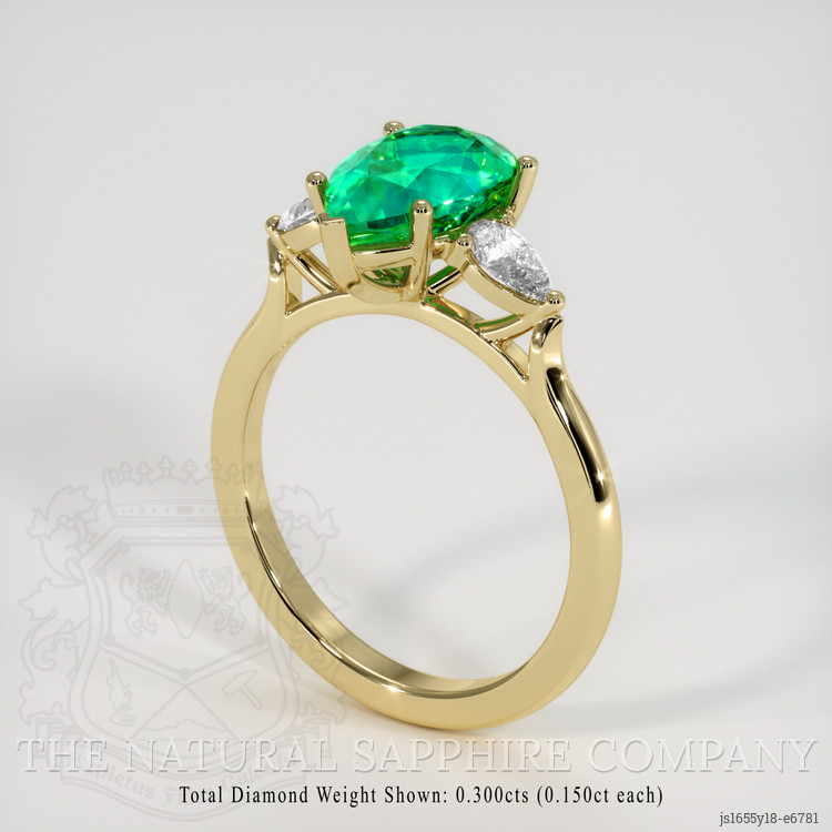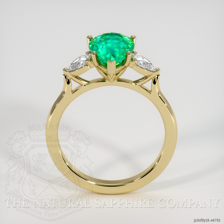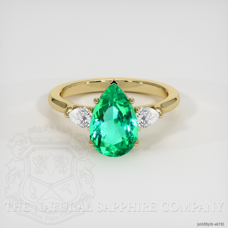 This ring centers on a striking transparent 1.69 carat pear shape green emerald, measuring 10.24 by 6.75 by 4.60 millimeters, with a mixed brilliant cut that maximizes brilliance and face up presence. The emerald shows intense color saturation with a clarity grade of very slightly included, evaluated at eye level, and an excellent polish, enhancement is standard, and the gem is sourced from Colombia. Compared to many market examples that trade off transparency for heavy clarity obstructions, this stone combines rare transparency with deep Colombian green, making it a superior choice for collectors and discerning buyers. The design is flanked by white pear shaped natural diamonds weighing approximately 0.30 carats total, with clarity grades of Very Slightly Included VS1, VS2, and a color grade of E, providing bright, colorless contrast that amplifies the emeralds vivid hue and silhouette. The entire composition is set in 18K yellow gold, a warm metal that complements the green tone more naturally than cooler alloys, and the mixed brilliant cut pear shape brings a modern sparkle that outperforms traditional step cut emerald cuts in light return and liveliness.