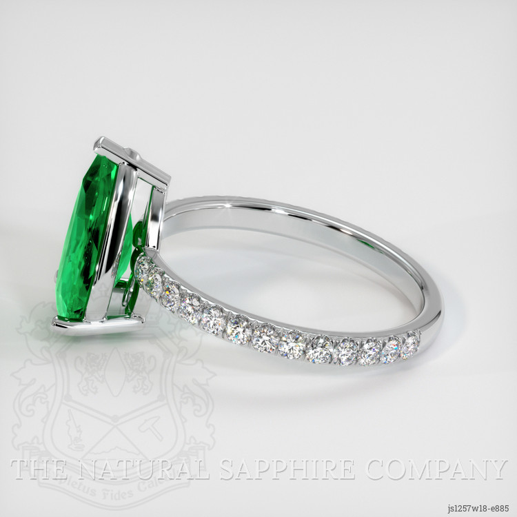 The ring features a beautiful, transparent 2.69 carat pear shape green emerald with the dimensions of 12.25 x 8.01 x 4.71 mm and a mixed brilliant cut. It has a clarity grade of very slightly included (evaluated at eye level), vivid color saturation, and an excellent polish. The origin of this emerald is Zambia.