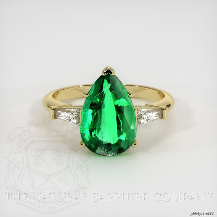 The ring features a beautiful, transparent 2.69 carat pear shape green emerald with the dimensions of 12.25 x 8.01 x 4.71 mm and a mixed brilliant cut. It has a clarity grade of very slightly included (evaluated at eye level), vivid color saturation, and an excellent polish. The origin of this emerald is Zambia.