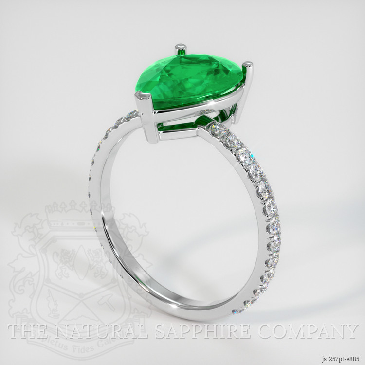 The ring features a beautiful, transparent 2.69 carat pear shape green emerald with the dimensions of 12.25 x 8.01 x 4.71 mm and a mixed brilliant cut. It has a clarity grade of very slightly included (evaluated at eye level), vivid color saturation, and an excellent polish. The origin of this emerald is Zambia.