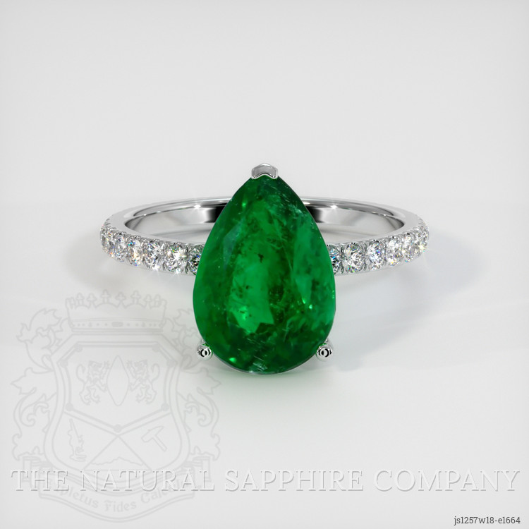 The ring features a beautiful, transparent 2.97 carat pear shape green emerald with the dimensions of 11.73 x 7.80 x 5.83 mm and a mixed brilliant cut. It has a clarity grade of slightly included (evaluated at eye level), vivid color saturation, and an excellent polish. The origin of this emerald is Zambia.