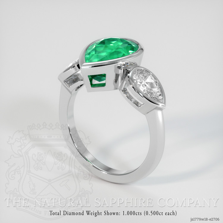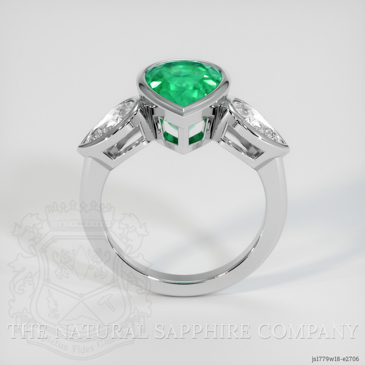 The quintessence of bespoke luxury manifests in every facet of this ring. The emerald is beautifully complemented by two pear-shaped white diamonds that collectively weigh approximately 1.00 carats. Each diamond is carefully selected for its VS1 to VS2 clarity and E color grade, ensuring that they harmonize perfectly with the central emerald. The diamonds sparkle with life, each facet precisely cut to complement the emerald's vibrant green hue. This duo of gleaming diamonds enhances and elevates the emerald's allure, creating an extraordinary interplay of brilliance and color. The expert craftsmanship is evident in the ring's 18K white gold setting, providing a seamless and sophisticated framework that highlights the gemstones’ inherent beauty.