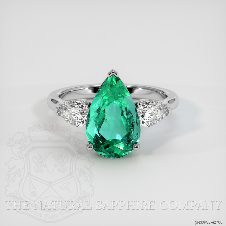 Adorning this emerald are two white pear-shaped diamonds of approximately 0.80 carats, their icy radiance a perfect counterpoint to the emerald's lush splendor. Graded as Very Slightly Included (VS1, VS2), with a color grade of G, these diamonds are like twin stars clasping the verdant gem, setting the stage for a brilliant interplay of light. Each diamond has been hand-selected and masterfully set to ensure it complements the ring's essence without overshadowing the emerald's allure. They add a structural response within the design reminiscent of those found in celebrated luxury jewelry houses, balancing opulence with understated elegance.