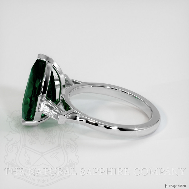Enhancing the central emerald are the graceful, white baguette-shaped diamonds that flank either side of the setting. Together they weigh approximately 0.60 carats, showcasing a Very Slightly Included (VS1, VS2) clarity and a color grade of E. These diamonds offer exceptional purity and brightness, further elevating the visual allure of the ring. The tapered shape of the baguette diamonds creates a seamless transition from the emerald, framing it with a whisper of brilliance. This thoughtful design choice enhances the overall harmony and sophistication of the piece.