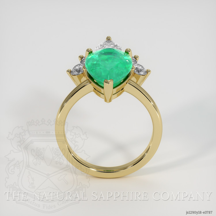 The setting pairs the central emerald with pear shaped white natural diamonds totaling approximately 0.50 carats and round white natural diamonds totaling approximately 0.64 carats, all graded E color, clarity Very Slightly Included, VS1 and VS2. These high color and clarity diamonds provide a bright white contrast that increases perceived brilliance surrounding the emerald, and their brilliant cuts enhance the ensemble by reflecting white light into the emerald pavilion. Set entirely in 18K yellow gold the warm metal tone complements the emeralds medium saturation and deepens the green visually without altering the gem chemistry. Compared to halo or pavé styles that maximize apparent size through peripheral smaller stones, this design uses select pear and round diamonds to focus light and shape rather than to overwhelm the center stone. For clients assessing light performance the mixed brilliant pear delivers a balanced presentation, combining the color emphasis of step influenced cuts and the scintillation of brilliant faceting, a combination that suits the natural characteristics of Brazilian emeralds and the refined styling curated by The Natural Emerald Company.