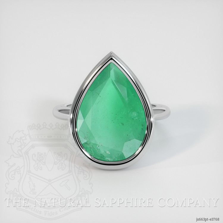 The ring features a beautiful, transparent 8.60 carat pear shape green emerald with the dimensions of 17.97 x 12.37 x 7.01 mm and a mixed brilliant cut. It has a clarity grade of slightly included (evaluated at eye level), intense color saturation, and an excellent polish. The origin of this emerald is Brazil.