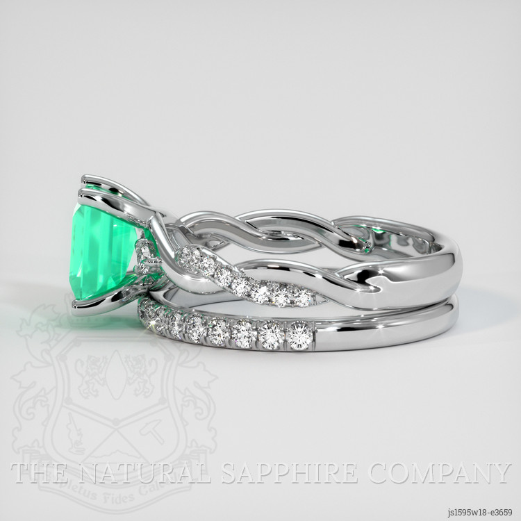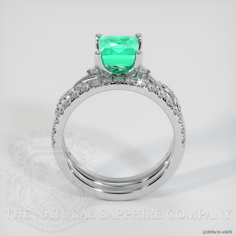 The ring features a beautiful, transparent GRS certified 1.32 carat princess shape green emerald with the dimensions of 6.73 x 5.92 x 4.02 mm and a princess cut. It has a clarity grade of very slightly included (evaluated at eye level), light color saturation, and an excellent polish. The origin of this emerald is Colombia.