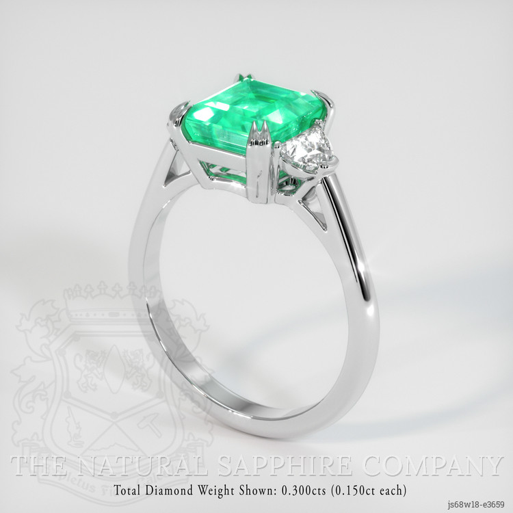 The ring features a beautiful, transparent GRS certified 1.32 carat princess shape green emerald with the dimensions of 6.73 x 5.92 x 4.02 mm and a princess cut. It has a clarity grade of very slightly included (evaluated at eye level), light color saturation, and an excellent polish. The origin of this emerald is Colombia.