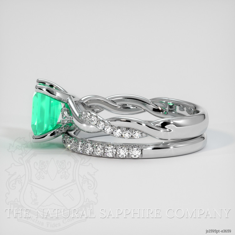 The ring features a beautiful, transparent GRS certified 1.32 carat princess shape green emerald with the dimensions of 6.73 x 5.92 x 4.02 mm and a princess cut. It has a clarity grade of very slightly included (evaluated at eye level), light color saturation, and an excellent polish. The origin of this emerald is Colombia.