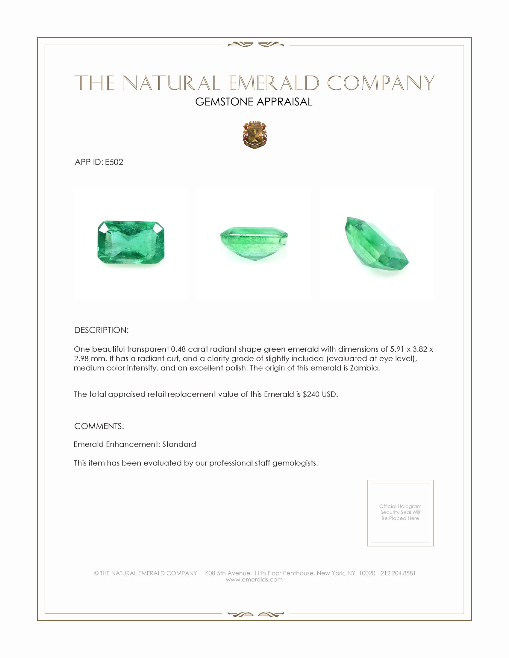 The ring features a beautiful, transparent 0.48 carat radiant shape green emerald with the dimensions of 5.91 x 3.82 x 2.98 mm and a radiant cut. It has a clarity grade of slightly included (evaluated at eye level), medium color saturation, and an excellent polish. The origin of this emerald is Zambia.