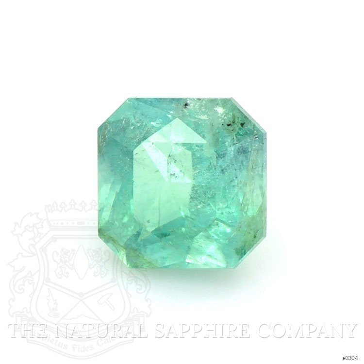The ring features a beautiful, transparent 1.87 carat radiant shape green emerald with the dimensions of 7.56 x 7.44 x 5.43 mm and a radiant cut. It has a clarity grade of slightly included (evaluated at eye level), light color saturation, and an excellent polish. The origin of this emerald is Ethiopia.