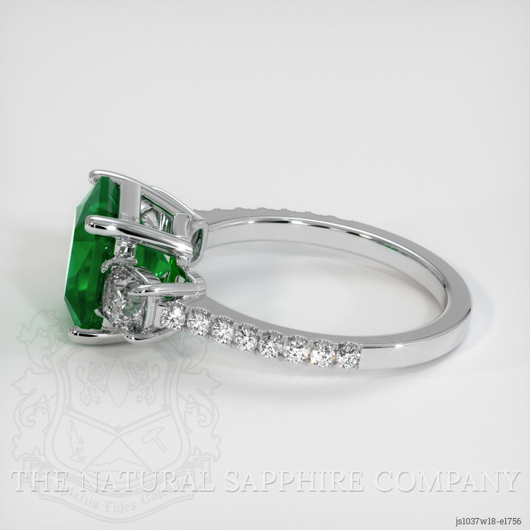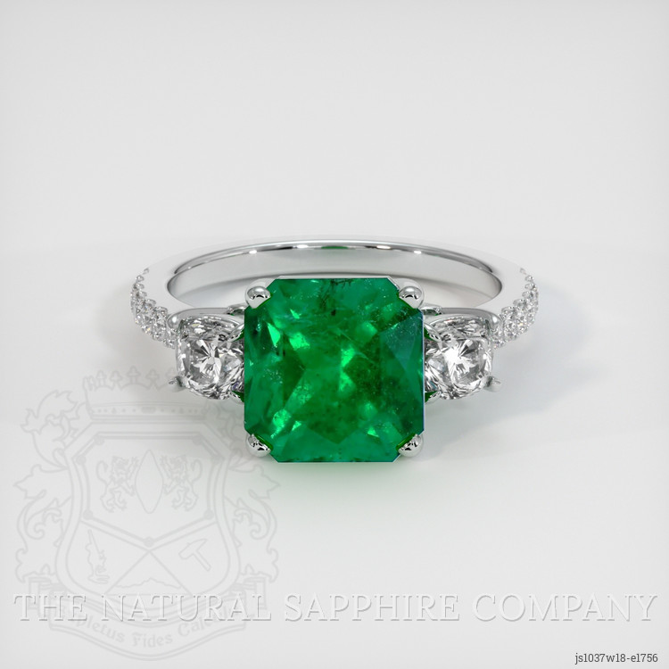 The ring features a beautiful, semi-transparent 2.81 carat radiant shape green emerald with the dimensions of 8.57 x 8.38 x 6.34 mm and a radiant cut. It has a clarity grade of very slightly included (evaluated at eye level), vivid color saturation, and an excellent polish. The origin of this emerald is Zambia.