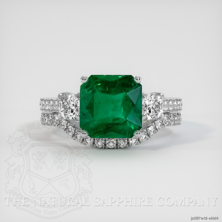 The ring features a beautiful, transparent 3.02 carat radiant shape green emerald with the dimensions of 9.24 x 9.08 x 5.61 mm and a radiant cut. It has a clarity grade of slightly included (evaluated at eye level), vivid color saturation, and an excellent polish. The origin of this emerald is Brazil.