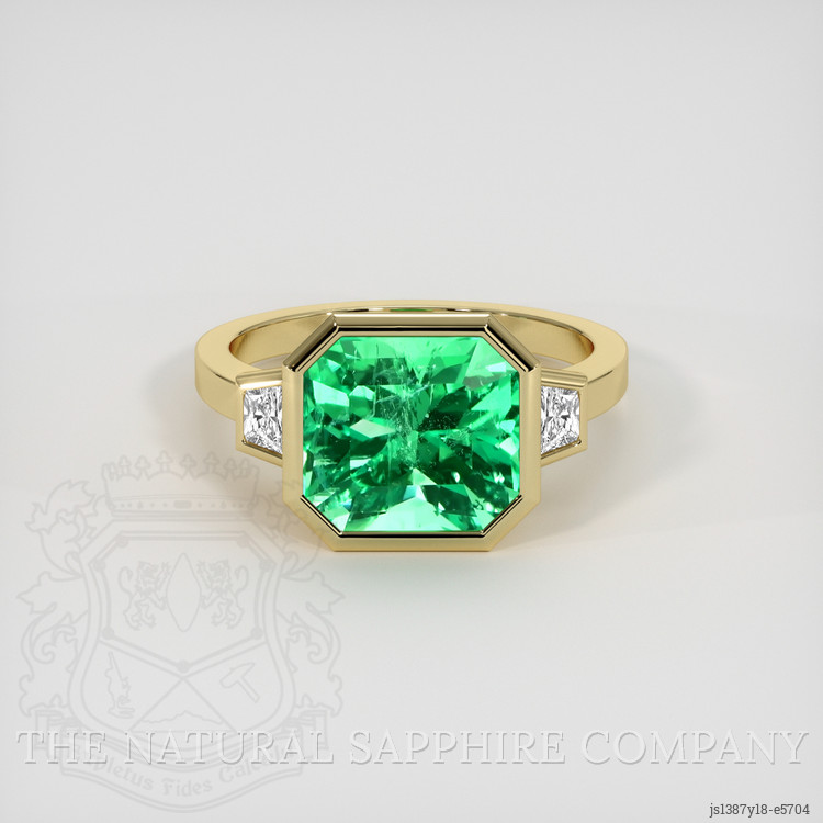 Accompanying the emerald are white trapezoid shaped natural diamonds, weighing approximately 0.30 carats. These diamonds, with a clarity of Very Slightly Included (VS1, VS2) and a color grade of E, add a celestial shimmer to the piece. Their refined brilliance contrasts beautifully with the deep green of the emerald, creating a harmonious balance that symbolizes a lifelong commitment. This ring serves as a testament to enduring love and unity, just as precious stones have symbolized for centuries.