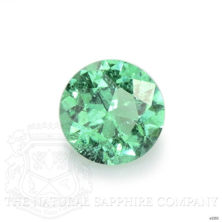 The ring features a beautiful, transparent 0.41 carat round shape green emerald with the dimensions of 4.99 x 4.98 x 3.15 mm and a mixed brilliant cut. It has a clarity grade of very slightly included (evaluated at eye level), medium color saturation, and an excellent polish. The origin of this emerald is Zambia.
